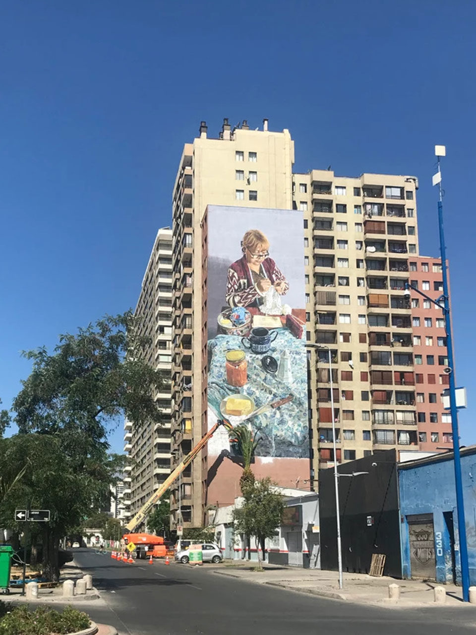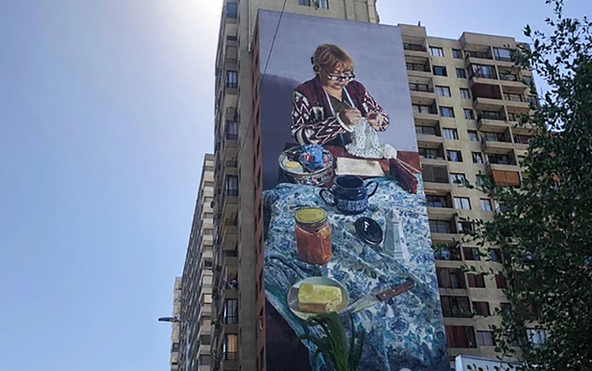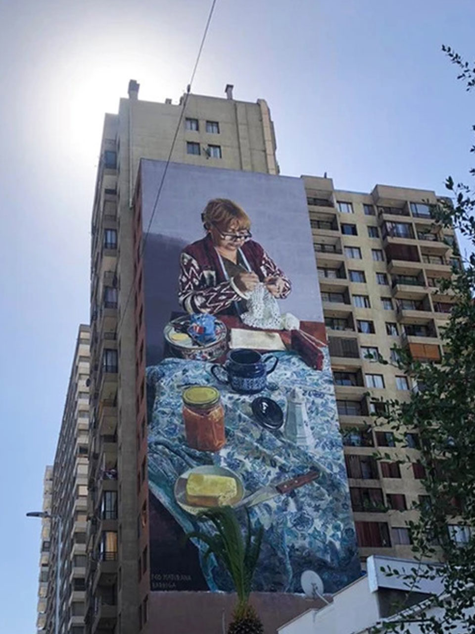 En la escena, una señora teje a crochet sobre una mesa en la que, al parecer, se sirvió o se servirá una típica once ; María Antonieta de 72 años es vecina del edificio y costurera del barrio Matta y, desde hace poco menos de 3 semanas, su imagen ha quedado inmortalizada en lo que probablemente sea uno de los murales más grandes –sino el más grande– de nuestro país.