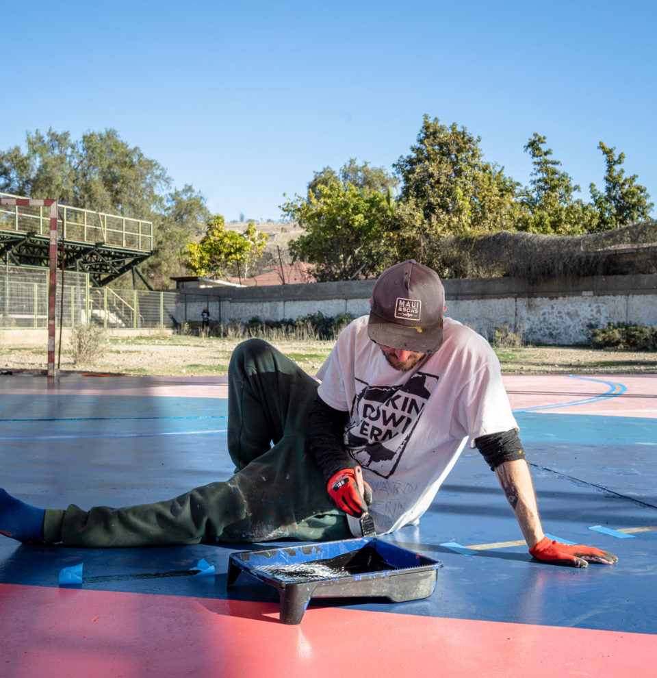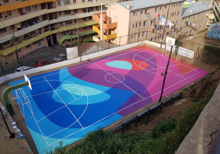 Pintar un muro, simplificar la estructura arquitectónica conversando con el paisaje de manera armónica y desapercibida. A través de colores penetrantes, Matu entra en nuestro imaginario de la forma más orgánica. Sus ondas se proyectan entre la arquitectura y el paseo de sus visitantes. Como arquitecto, el artista sabe manejar lo que le entregan las líneas, la profundidad y la perspectiva para crear un diálogo entre lo que se plasma en el muro y su forma.