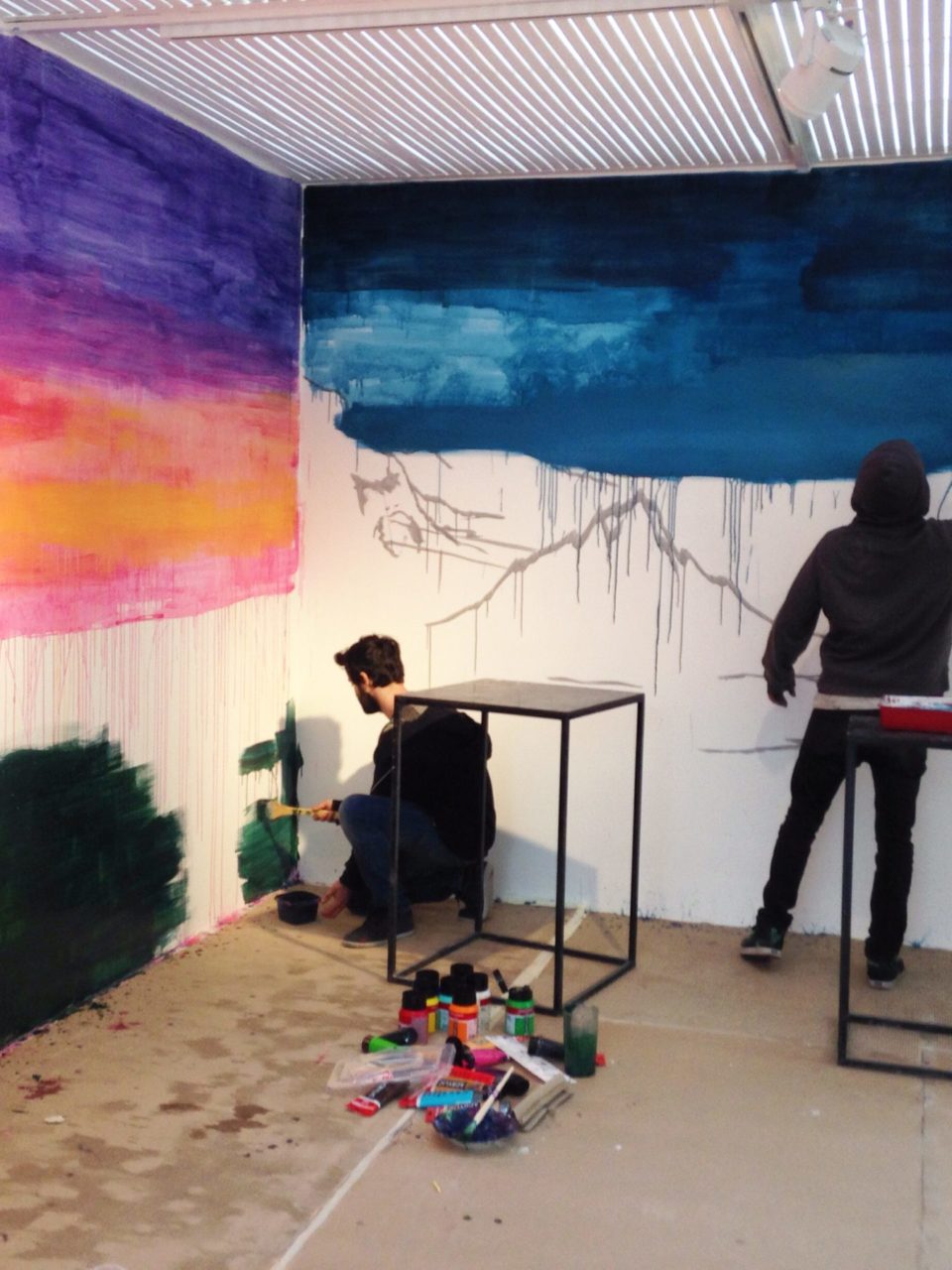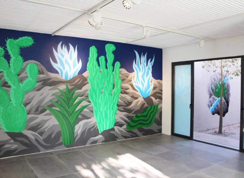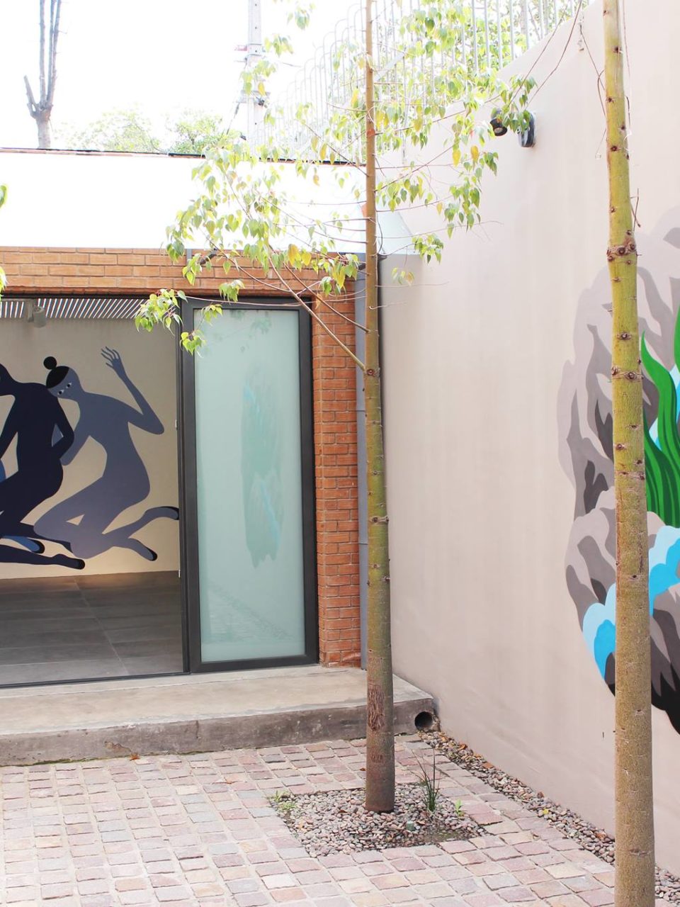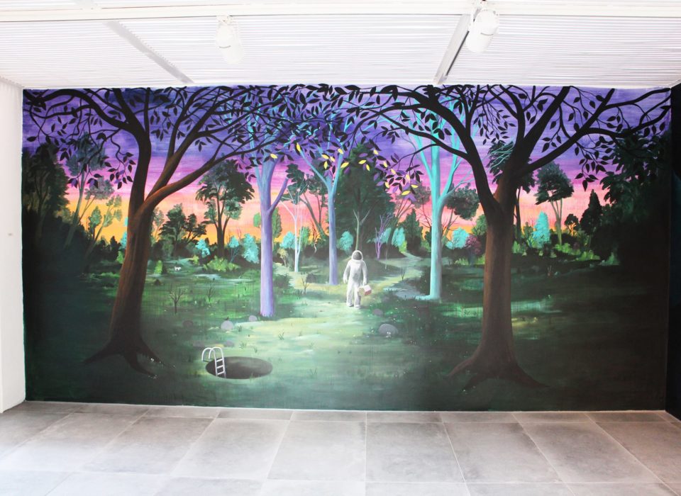Siguiendo su línea de trabajo ligada al muralismo, cada artista transformó un muro de las salas de exposición en un universo surrealista. La primera sala compartida por Santiago Ascui y Yaikel representa la técnica minimalista del graffiti, con figuras conformadas por colores planos que se despliegan del muro a través de los recortes de las líneas del spray. Figuras en movimiento que en el muro de Santiago escenifican personajes inundados por un halo de misterio por bordear la línea entre lo andrógeno y lo humano; mientras que en el muro de Yaikel sobresalen como vegetaciones en un paisaje rocoso que parecieran estar en un trance cósmico, pasando de su estado vegetal a seres espirituales.