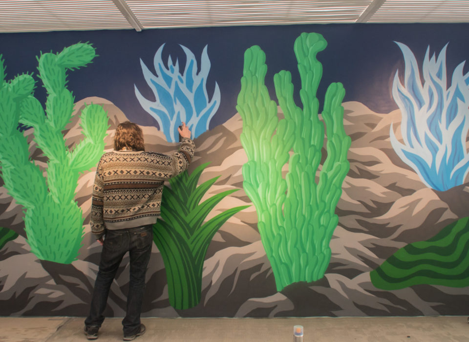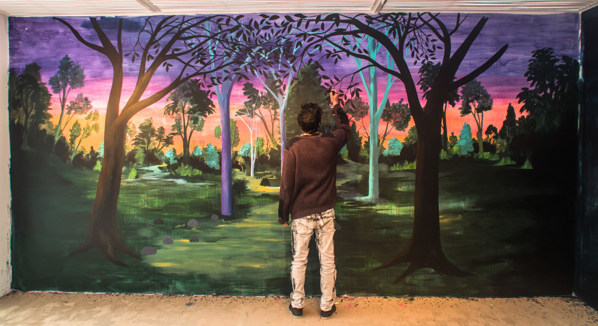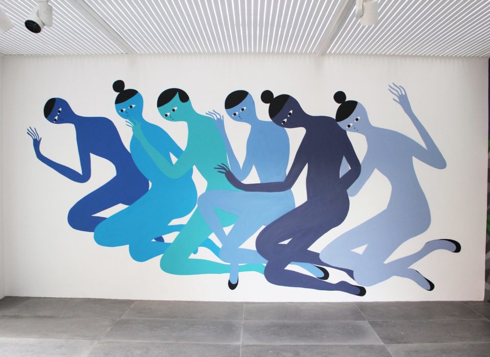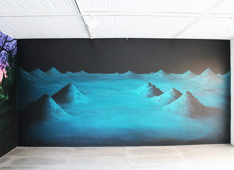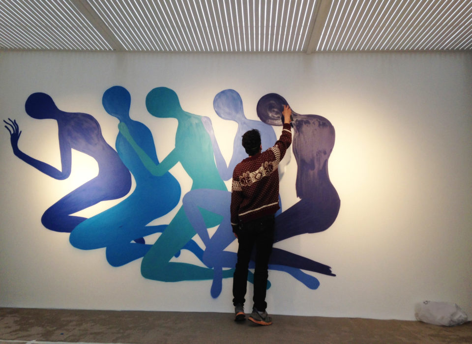 Siguiendo su línea de trabajo ligada al muralismo, cada artista transformó un muro de las salas de exposición en un universo surrealista. La primera sala compartida por Santiago Ascui y Yaikel representa la técnica minimalista del graffiti, con figuras conformadas por colores planos que se despliegan del muro a través de los recortes de las líneas del spray. Figuras en movimiento que en el muro de Santiago escenifican personajes inundados por un halo de misterio por bordear la línea entre lo andrógeno y lo humano; mientras que en el muro de Yaikel sobresalen como vegetaciones en un paisaje rocoso que parecieran estar en un trance cósmico, pasando de su estado vegetal a seres espirituales.