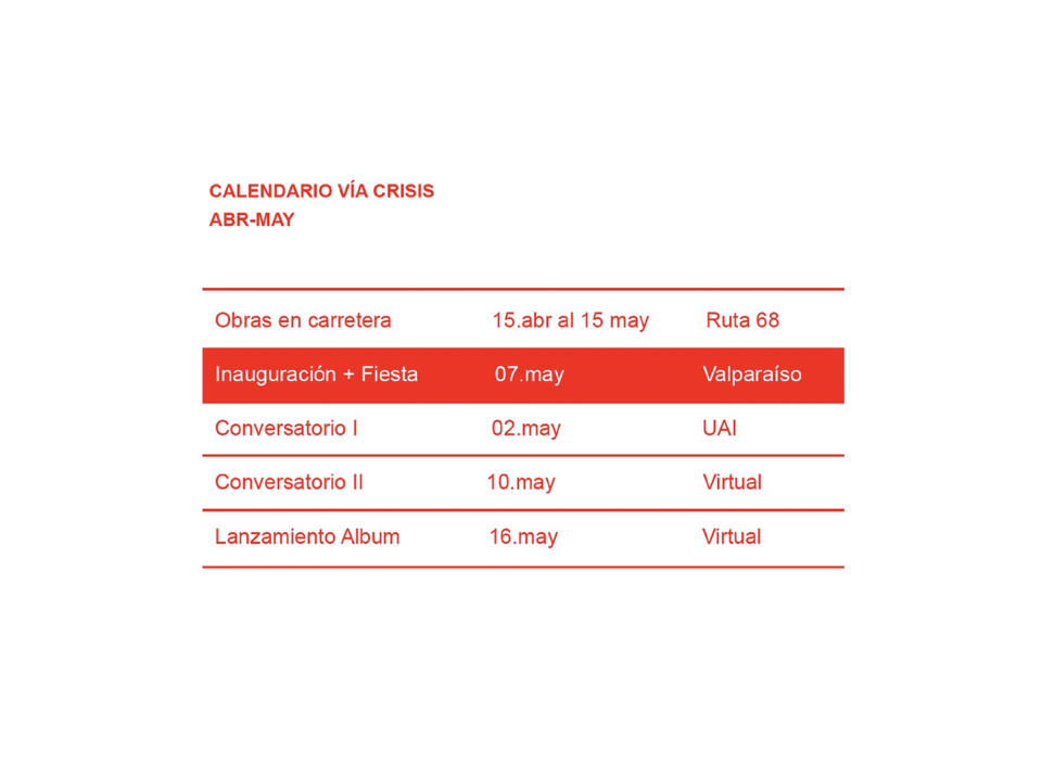 Vía Crisis es una exposición de poesía visual emplazada en 15 vallas publicitarias de la Ruta 68, donde se interrumpió la publicidad en la vía durante un mes para generar una experiencia de recorrido artístico apreciado en velocidad.