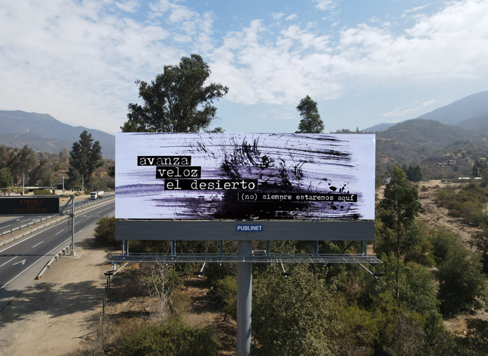 La muestra se despliega en distintas plataformas: visualmente, en las quince vallas publicitarias de gran tamaño ubicadas en los costados de la ruta 68, entre Santiago y Valparaíso; visual y sonoramente en una sala de exposiciones; y digitalmente en la web.