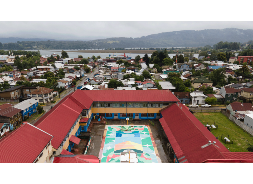 La intervención, se presentó como una oportunidad para transformar la escuela, revitalizando el mayor punto de encuentro para la comunidad escolar, el cual se encontraba en total deterioro. A la vez, se integraron elementos identitarios propios de Valdivia, como los humedales, el follaje de los árboles nativos y flora endémica –como el Calle-Calle y el brote del Canelo– asociada al crecimiento en los flujos de agua 🍃🌱