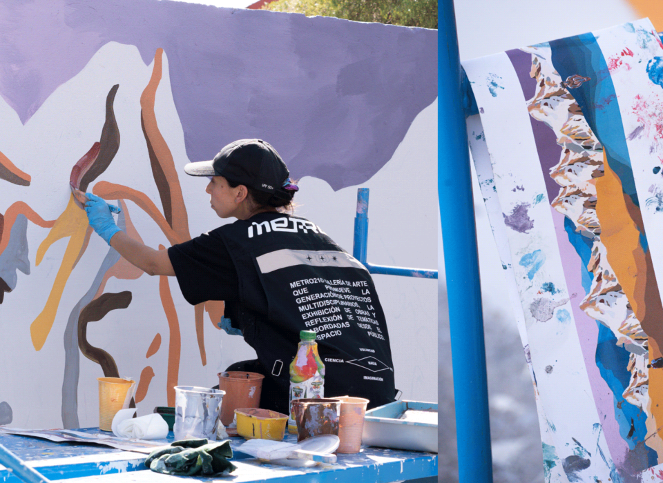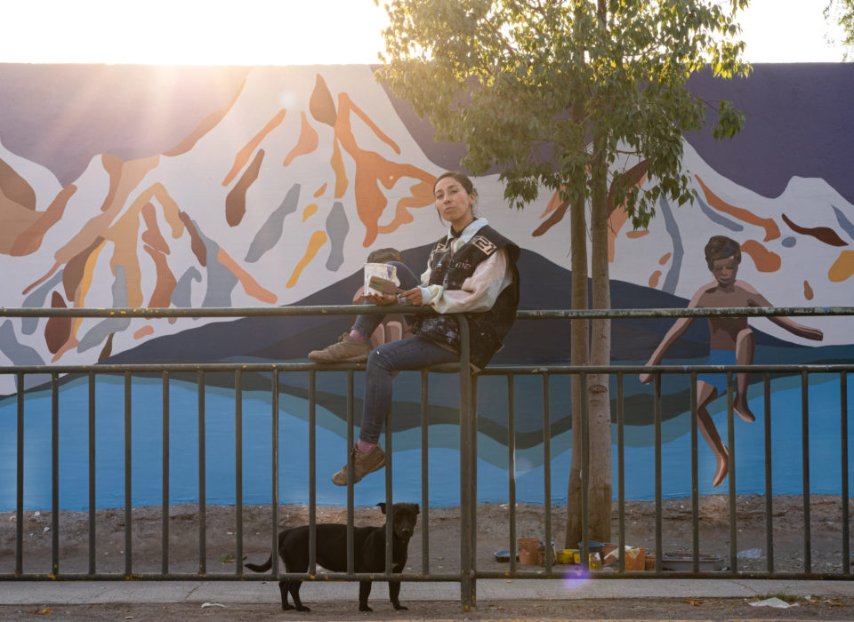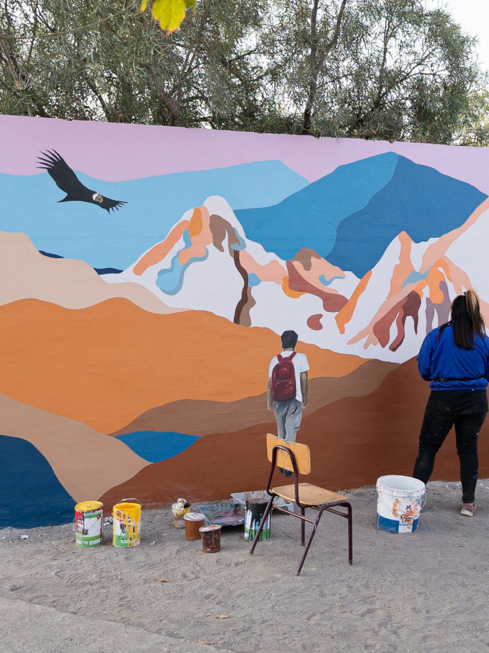 Yo me inspiro para poder trabajar la propuesta del mural a través de la cordillera, un elemento, un imaginario que está muy presente en esta comuna de la florida y como yo conecto esta majestuosa cordillera con los niños que también los incorporé en la inspiración y cómo estos niños se desenvuelven libres en este espacio de naturaleza.