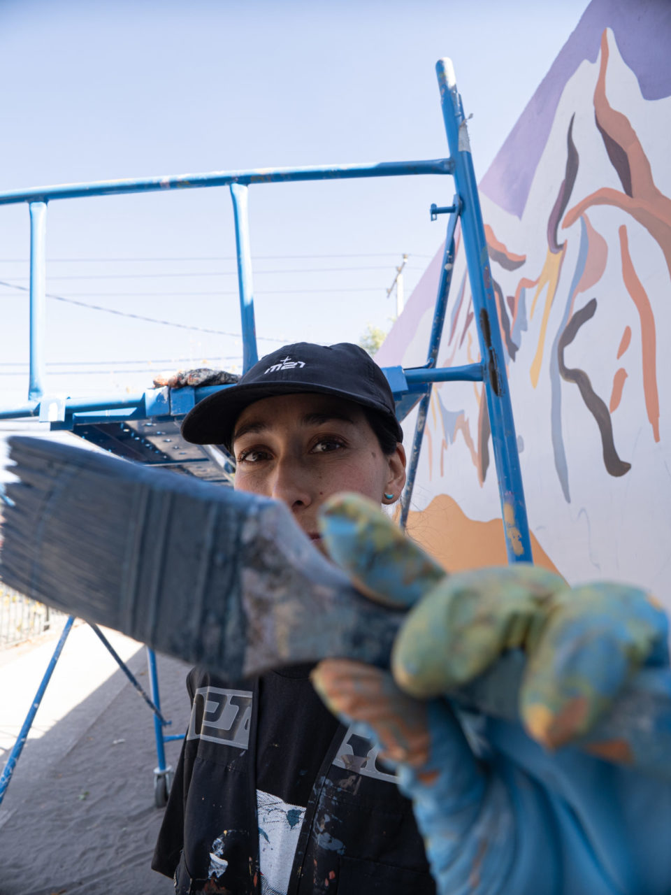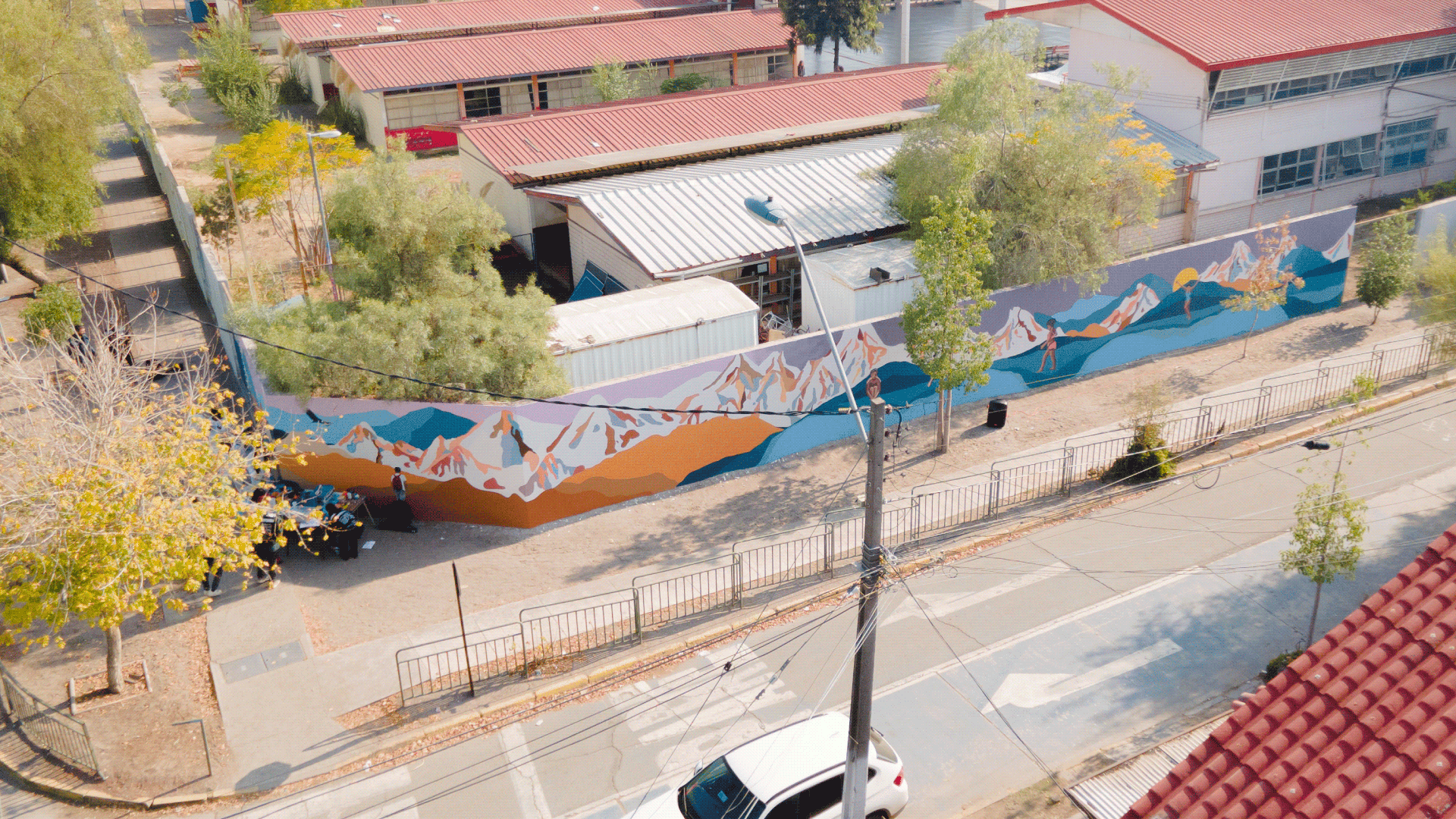 Apelando a imaginarios que nos son comunes, la artista representó la cordillera de Los Andes en el muro del Complejo Educacional Municipal Cardenal Antonio Samoré.
