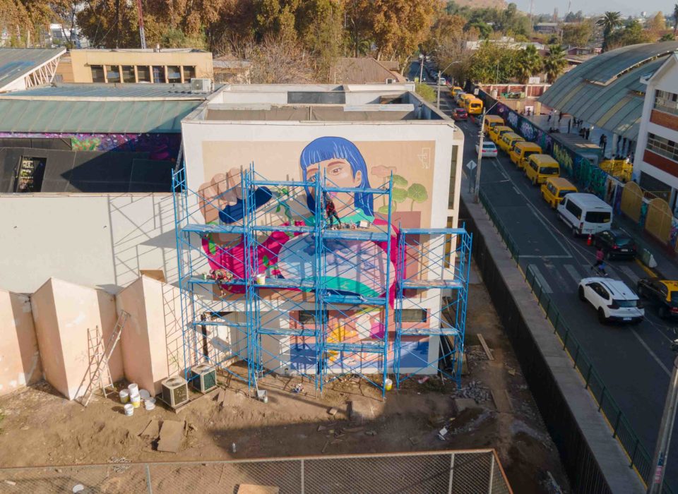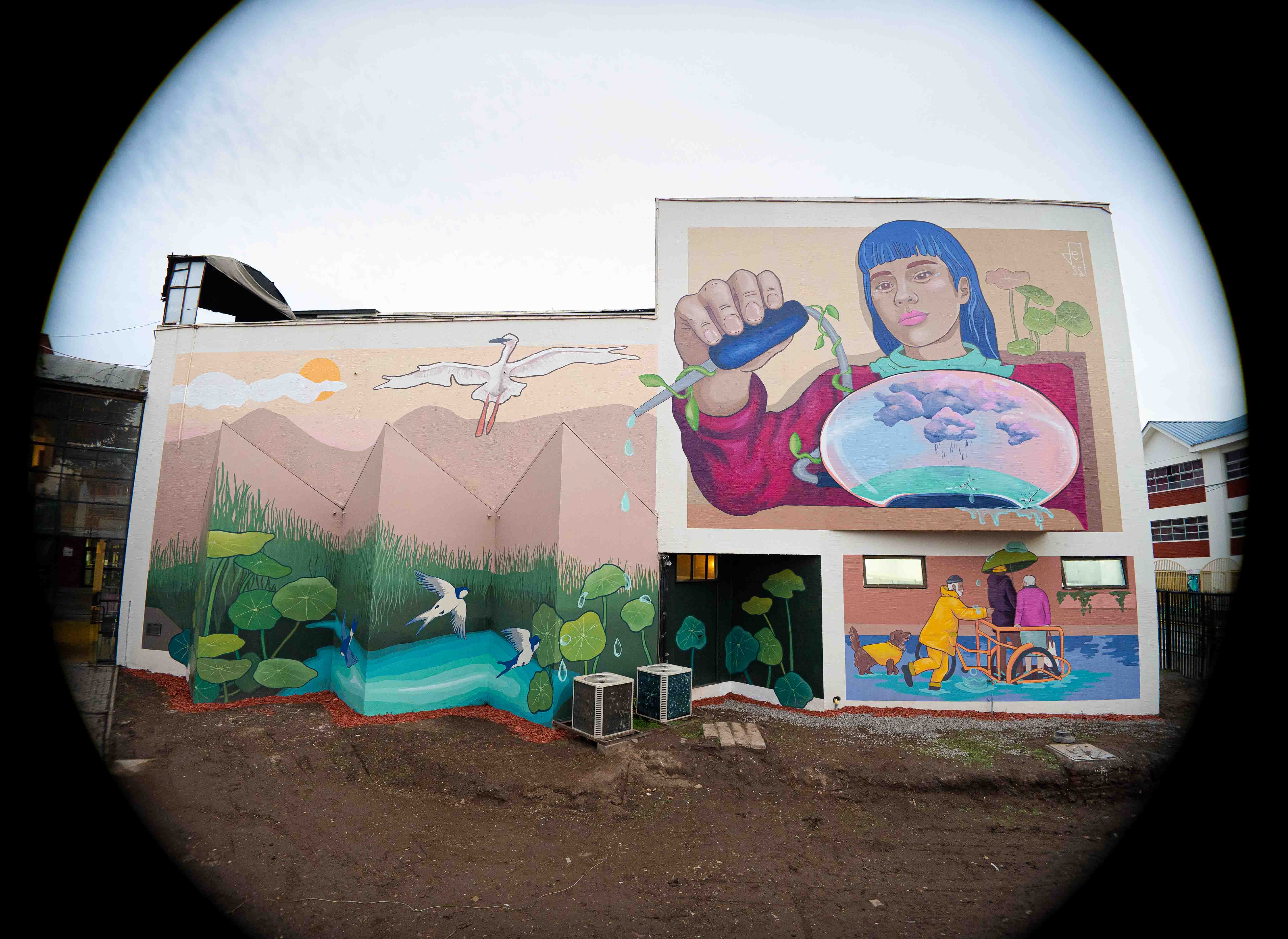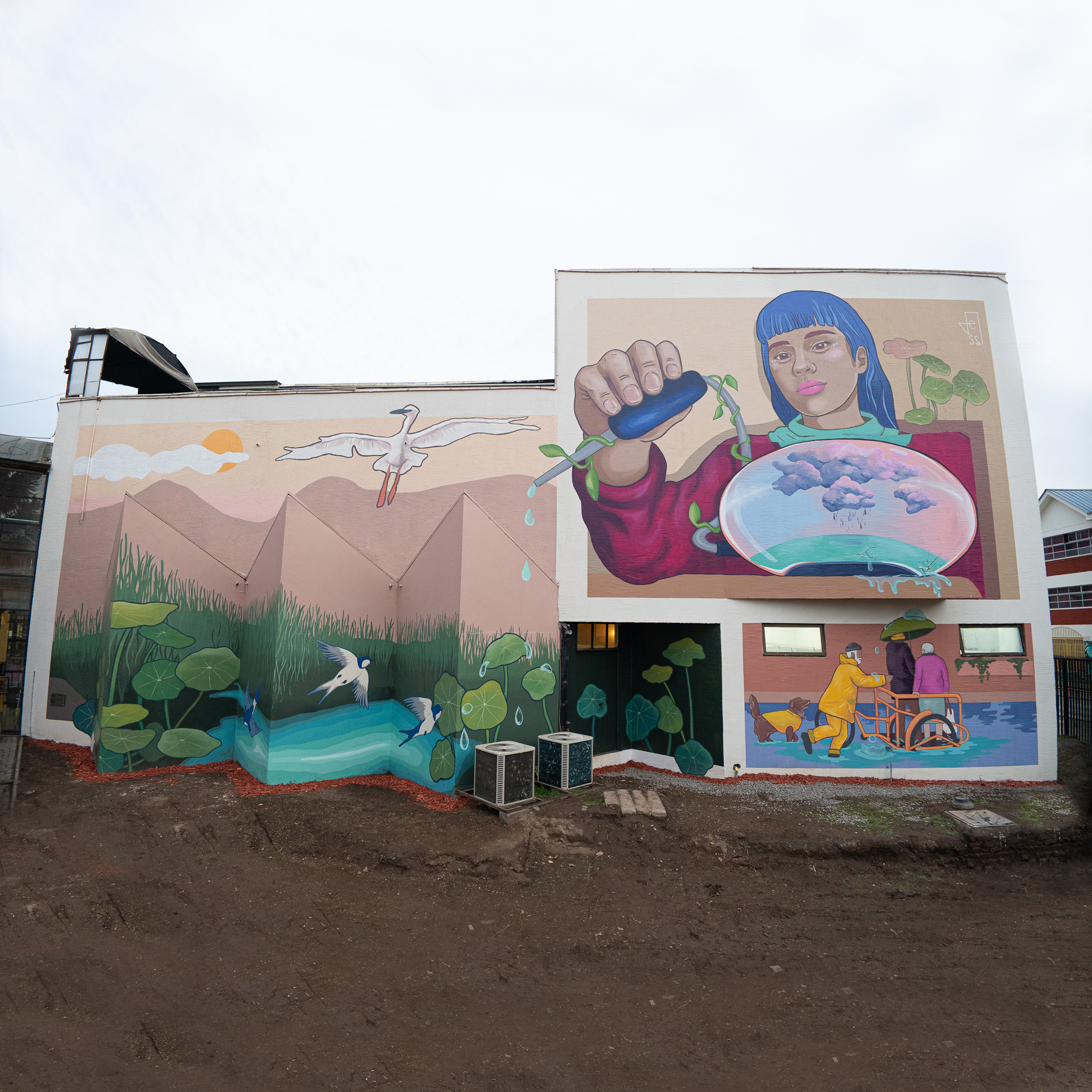 El mural «Afluencia finita» realizado en Quilicura por Jessica Frez (@jess_fz) está inspirado en el relato de Carolina Germania Gatica, llamado “La Lluvia no moja, pero inunda”.