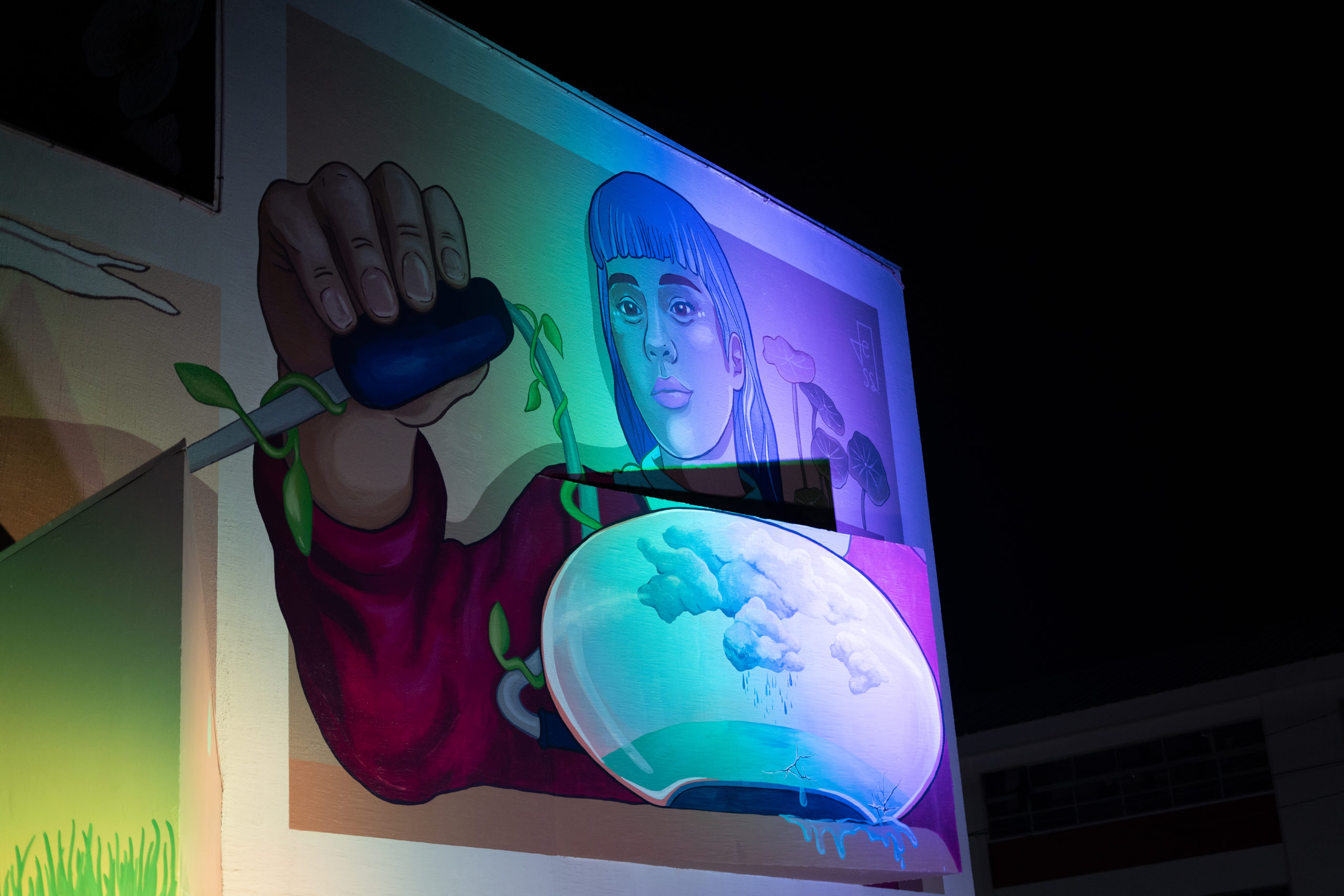 Fuertemente inspirado en el humedal de Quilicura –el más grande de toda la Región Metropolitana y el segundo más grande del país, con casi 500 hectáreas de superficie–, este mural involucra diferentes aspectos relacionados con la problemática del agua. La protagonista de la obra es una joven que tiene una esfera donde está contenida una tormenta. Ella intenta abastecer de agua el humedal, pero al mismo tiempo provoca una inundación. En el mural se representa una imagen típica de la capital cuando las calles de Santiago se inundan. La obra, ubicada a pasos de la Plaza de Armas de Quilicura, destaca por generar una síntesis del imaginario urbano y rural de la región.