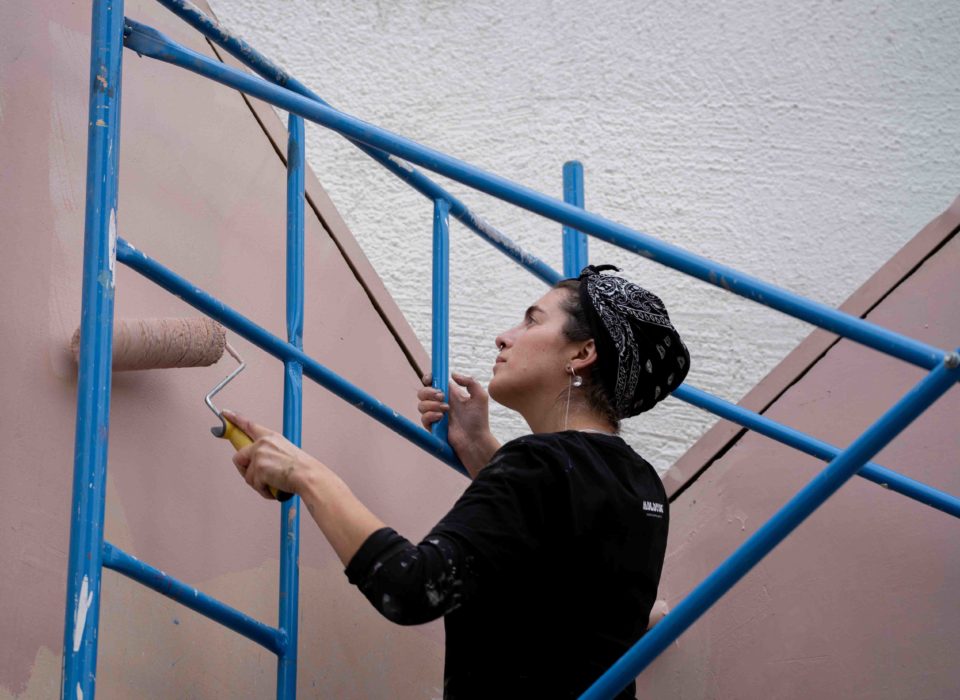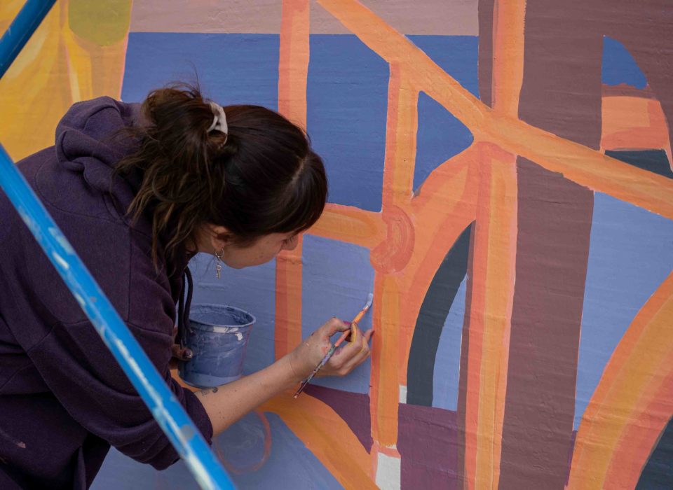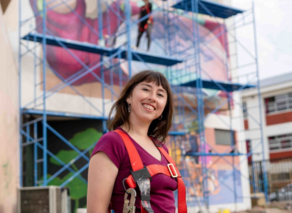 Jessica Frez es Arquitecta. Desde el año 2019 se ha involucrado en el mundo del muralismo pintando en distintos lugares. El enfoque de su trabajo es tratar de generar un estado, de lo que te produce estar en contacto con elementos naturales y cómo se vinculan estos elementos entre sí.