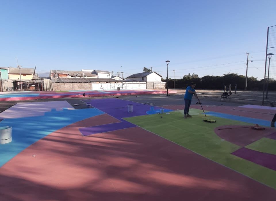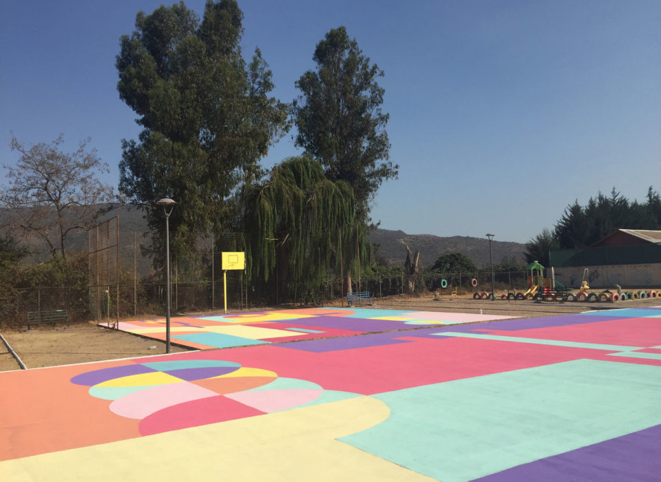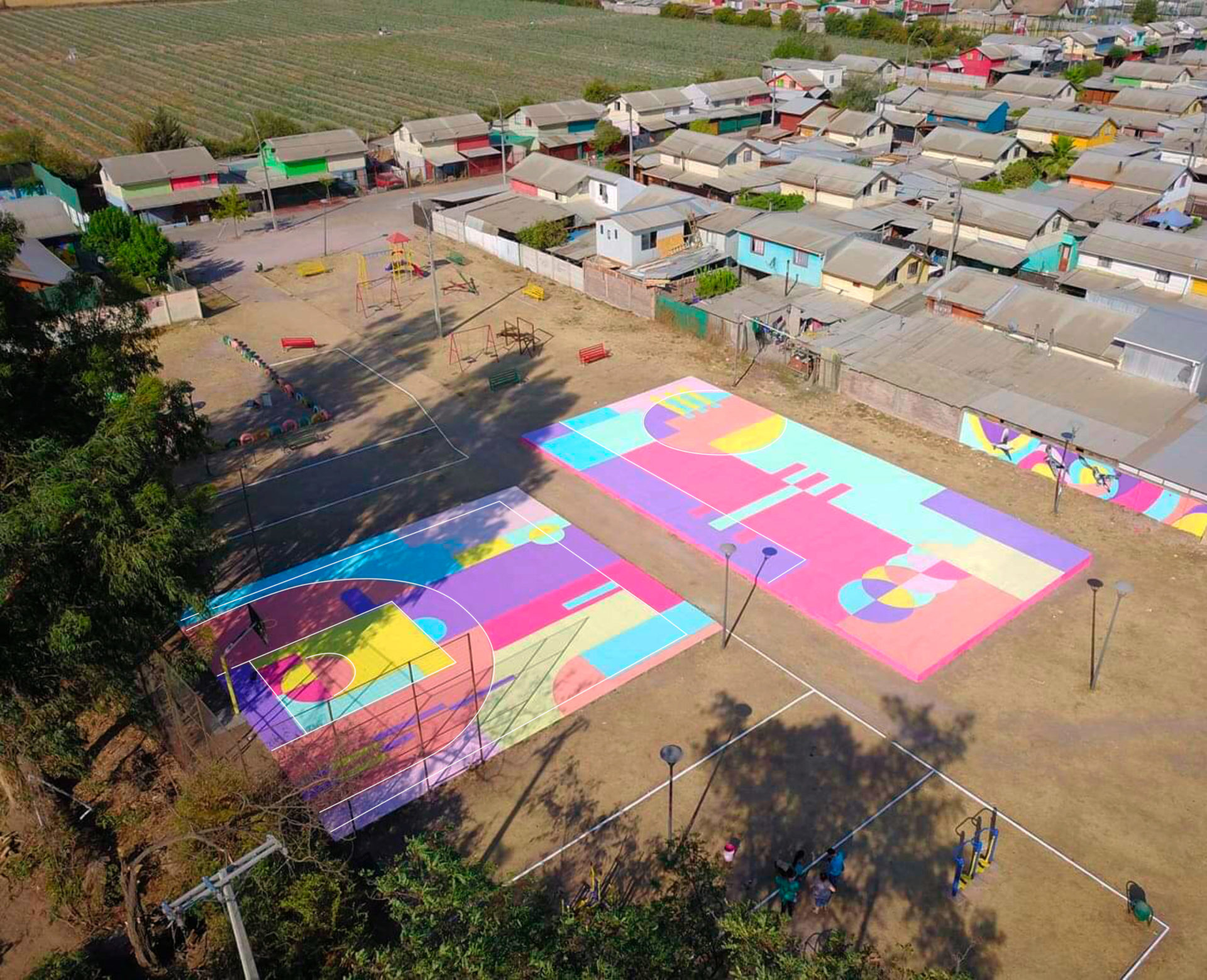 Las canchas se encuentran en la plaza de la Villa San José, barrio residencial de la zona rural de Chimbarongo. Al ser una de las pocas plazas del sector, se configura como punto de encuentro social de l-s niñ-s de la zona, quienes inventan nuevos juegos sobre estos colores. Generar un punto de fuga entre la naturaleza y la población, una inspiración en color de una ciudad con una geografía particular basada en la agronomía.