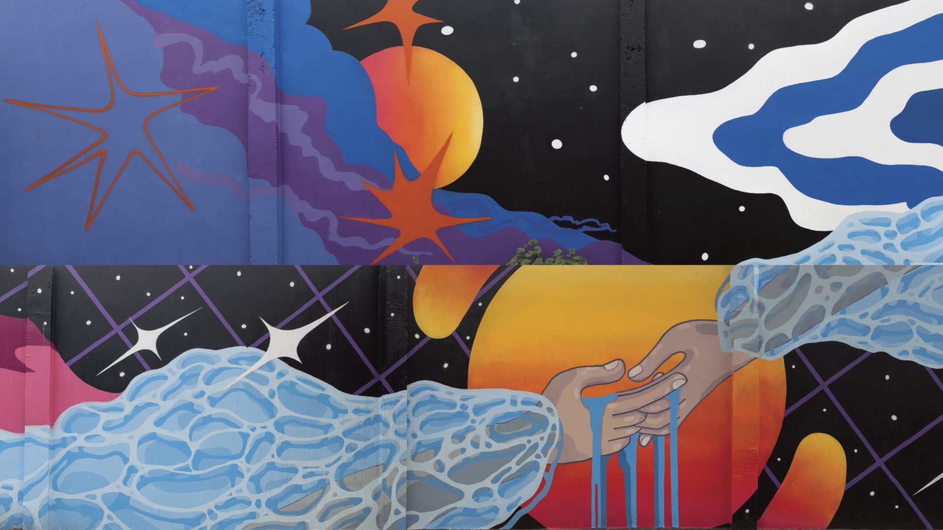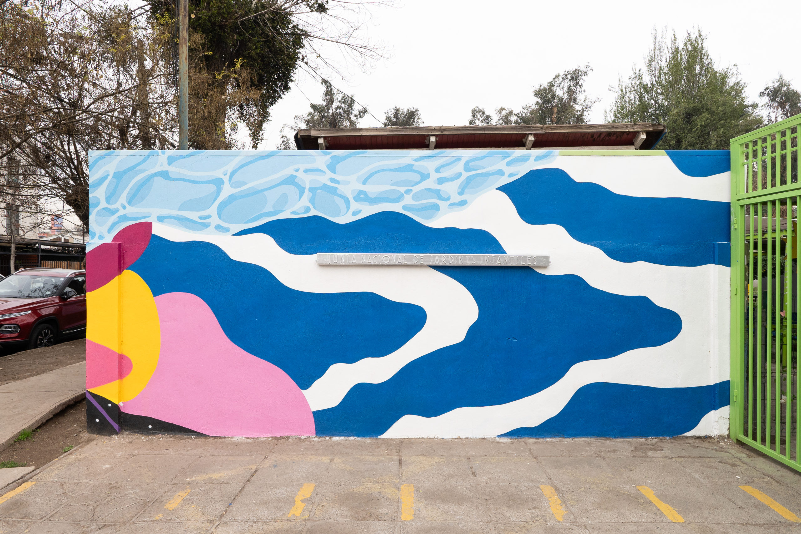 La obra busca representar cómo todos nos unimos a través del agua, que en su flujo va generando un enlace. En este proceso se genera la unión de fuerzas elementales donde miles de núcleos interactúan entre sí. Esta conexión se da tanto en el contenido de la obra como en su forma, puesto que une a todos los muros del jardín para crear un nuevo universo para los niños y el barrio.