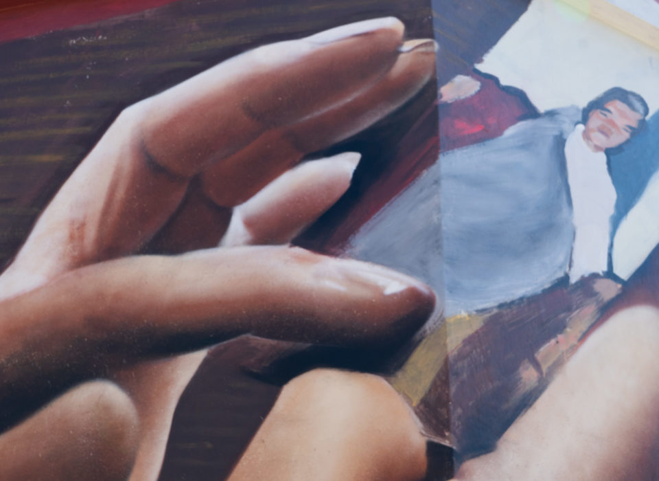 El mural es el retrato de la madre de la dueña de esta casa, quien lleva puesto el vestido que le dejó como herencia a su hija y se muestra observando fotografías de su historia familiar.
