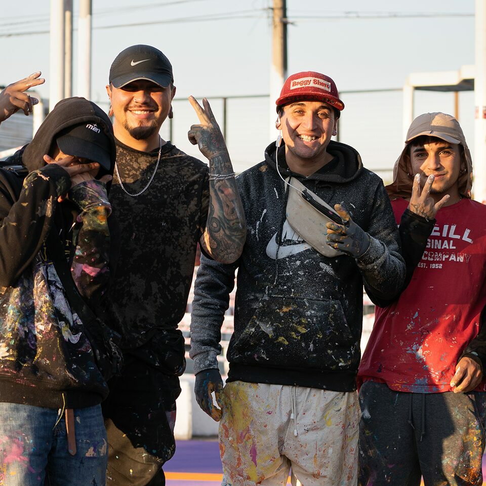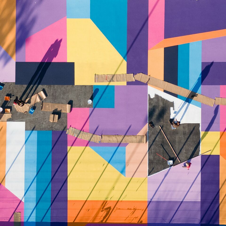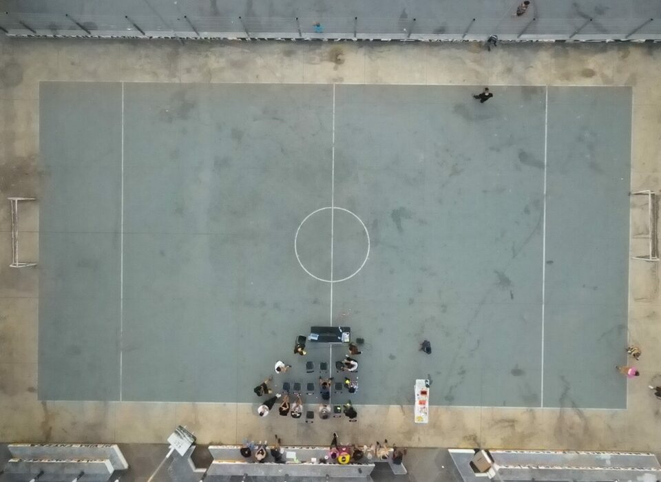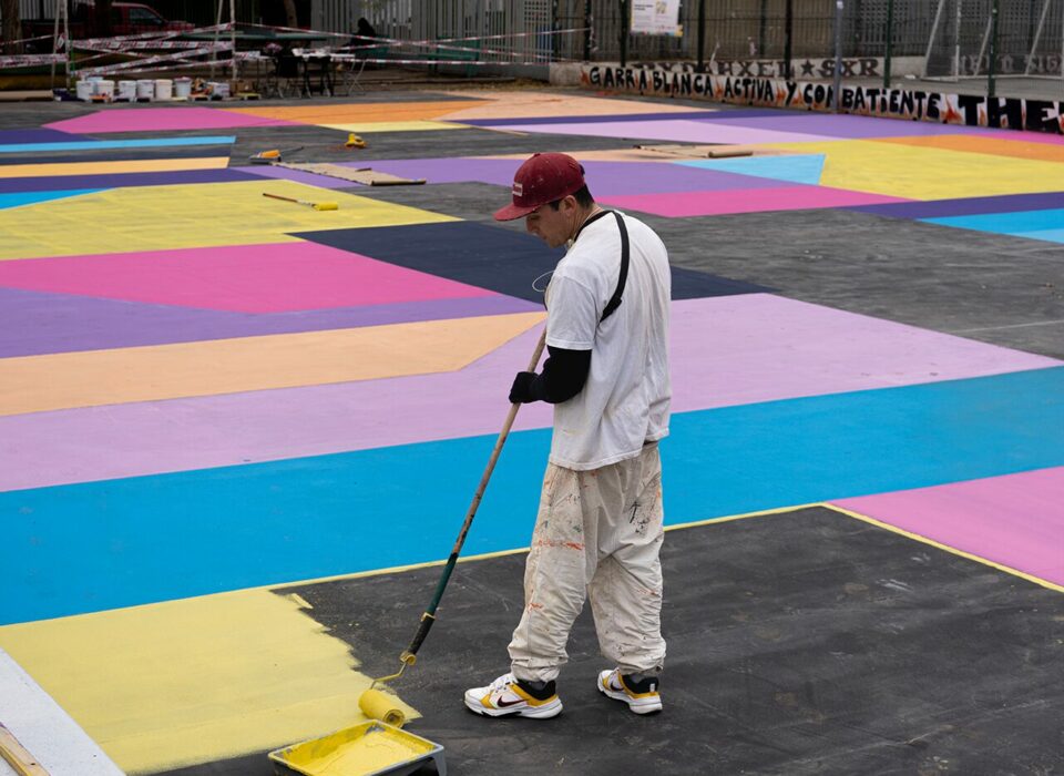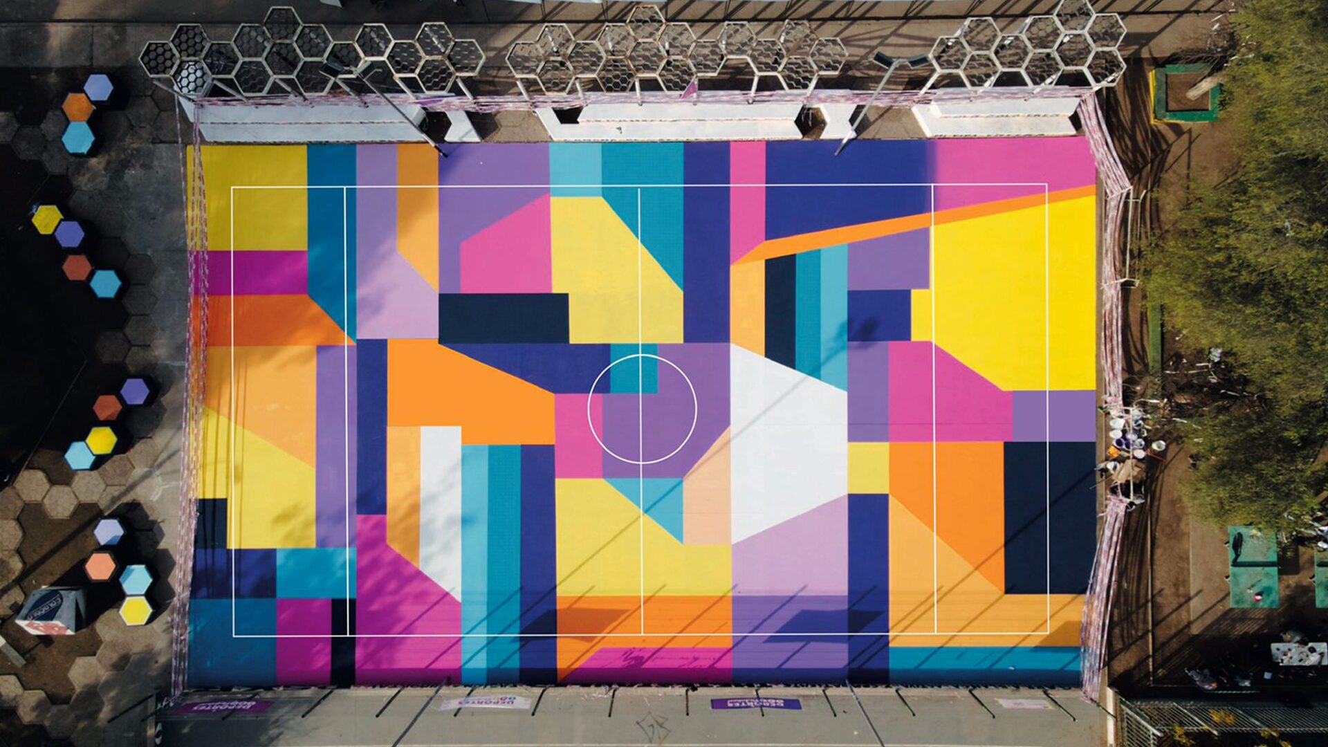 Esta obra se creó a partir de un proceso participativo donde la comunidad y el artista Soter codiseñaron esta propuesta. En los talleres de codiseño los vecinos y vecinas nos contaron parte de la historia de la cancha, su importancia para la comunidad y los elementos que debían verse plasmados en ella.