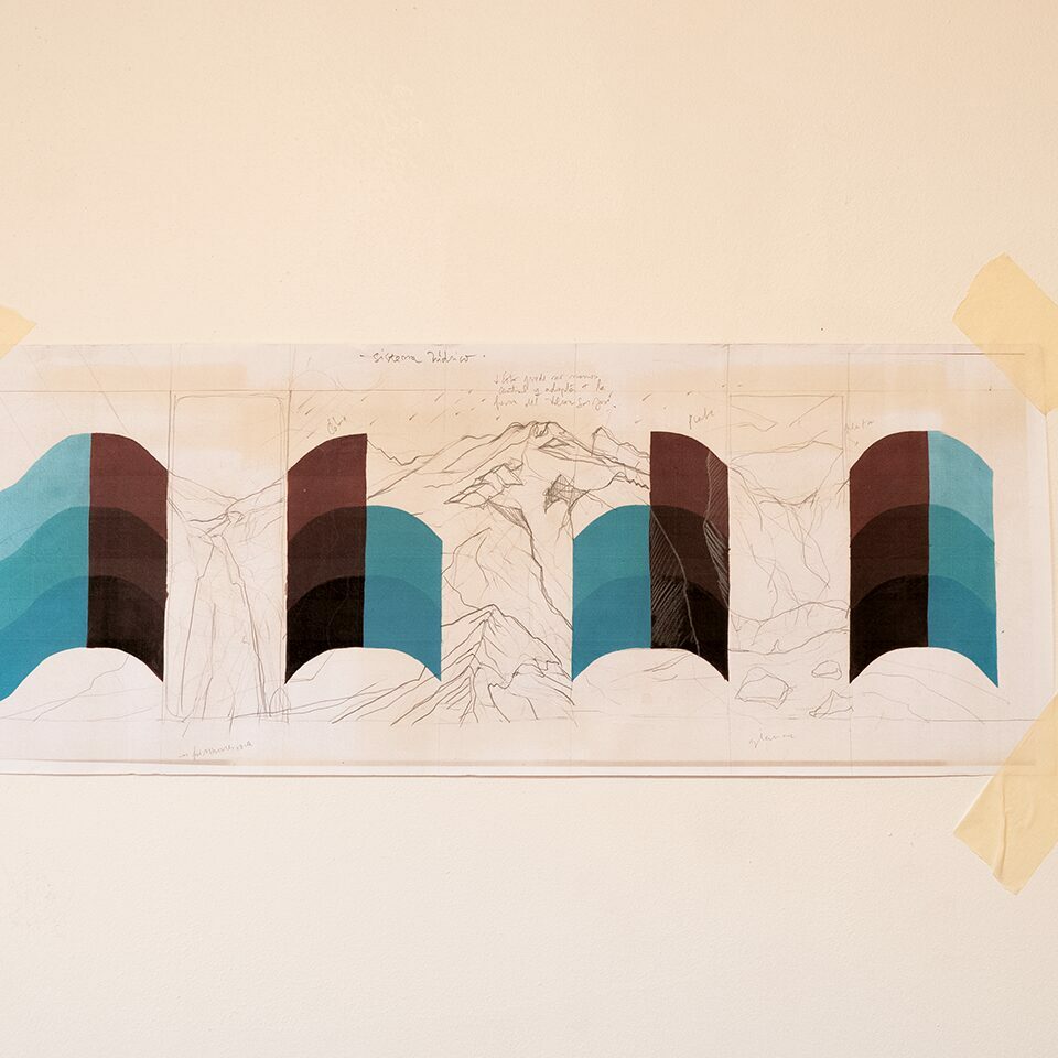 En el centro del mural, el volcán Maipo señala el nacimiento de la cuenca del río Maipo, relevante fuente de agua dulce que abastece gran parte de la Región Metropolitana y que desemboca en el Pacífico. En los costados, se presentan dos escenas de aluviones.