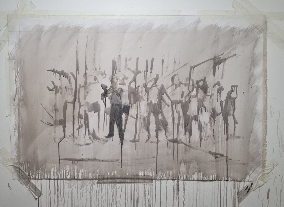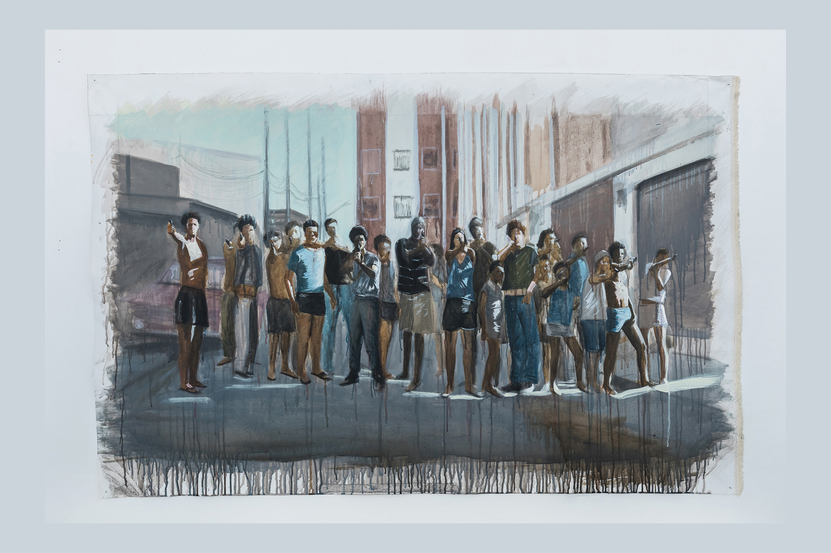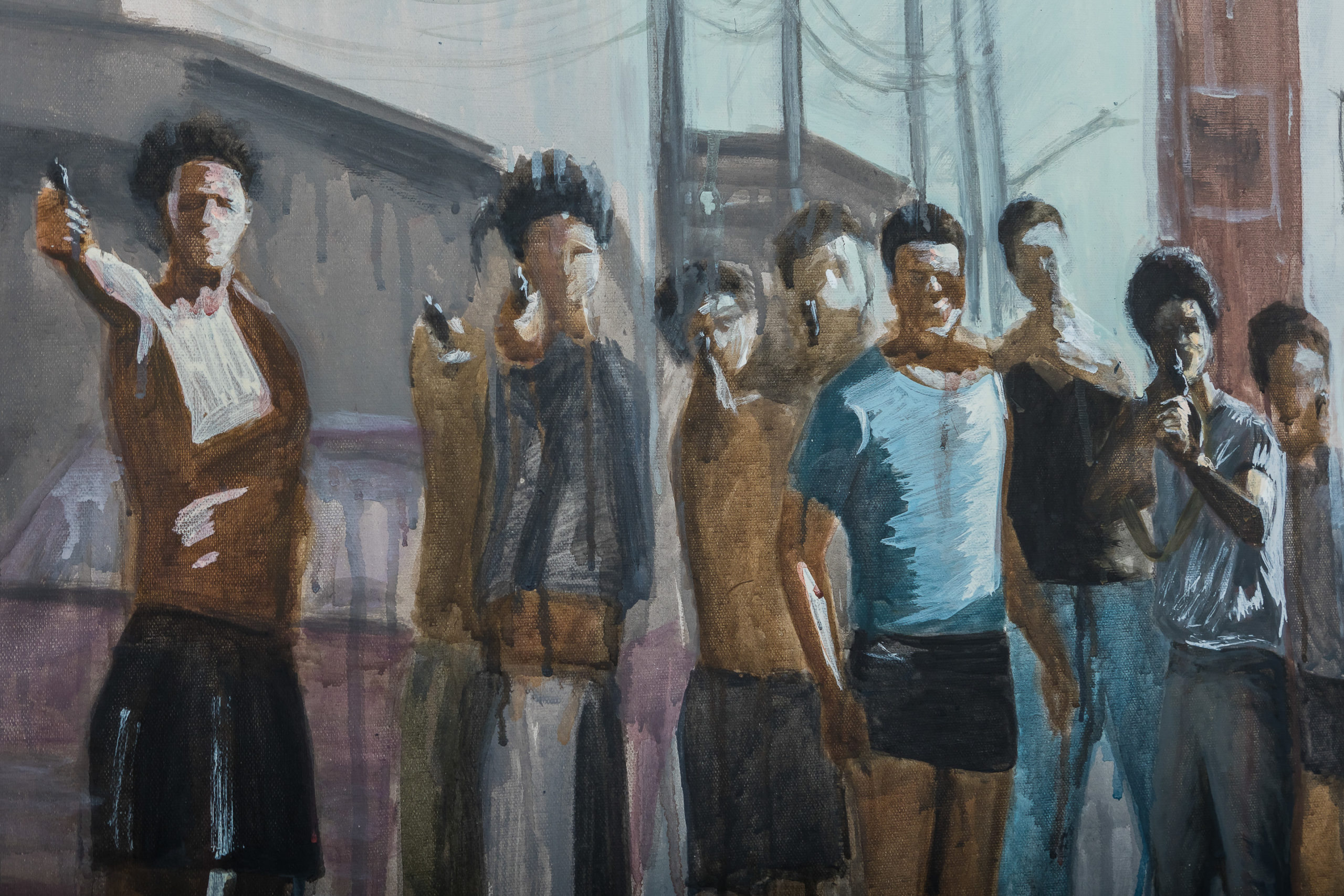 La pintura no respeta el margen hecho con lápiz mina en los bordes de la tela. En el fondo, en la esquina superior izquierda unas líneas grises que representan los postes de luz cruzan en forma vertical el verde agua del cielo. El edificio rojiblanco del fondo aparece como un bloque cortando la composición casi por la mitad en forma vertical. Mientras que líneas verticales esbozan en perspectiva el edificio que está a la derecha de la calle. En la vereda de enfrente hay unas casas en tonalidades grises y un fantasma de camioneta roja en las que recae la sombra proyectada por el edificio de al frente. En el primer plano la luz entra por un callejón que está a la derecha fuera del cuadro y recae en forma de pinceladas pastosas de témpera sobre el lado izquierdo de los personajes que me apuntan con sus armas. La luz es única dijo el Piero.
