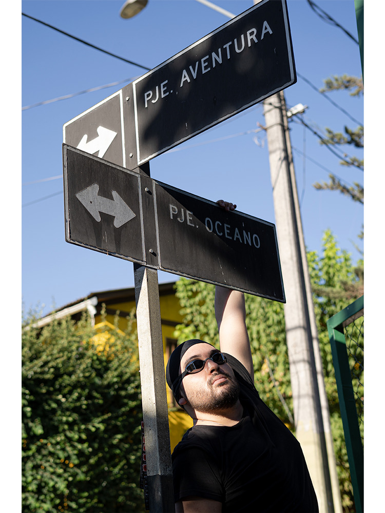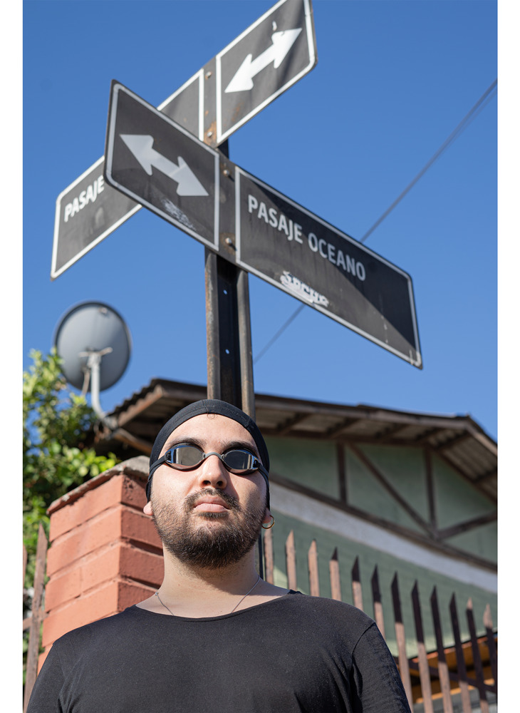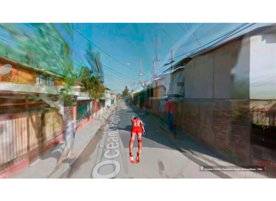 En 2018 aprendí a nadar, y desde ahí intermitentemente pero igual con cierta constancia me mantuve haciéndolo. Como claramente durante la cuarentena fue una imposibilidad poder nadar, mi manera de lidiar con esa añoranza era que me imaginaba nadando por las calles lagunas de mi barrio, y una de las cosas que tempranamente se me ocurrió fue realizar una escultura de una persona nadando en hormigón. No me fue factible realizarla en formato físico, pero también fue para mejor, porque después de llevar esa imagen que tenía en la cabeza a un fotomontaje digital fue que se me ocurrió la idea de ficcionarme a mí como un nadador de aguas de concreto. Y claro, lo que sucedió fue que todo lo que había hecho terminó decantando en el video “Cruzar a nado el Estrecho de Magallanes”, en el que por medio del croma y la grabación de la pantalla en Street View me superpuse nadando sobre las calles Océano Pacífico y Océano Atlántico que quedaban cerca de mi casa y que como el Estrecho mismo, tienen una intersección que las conecta.
