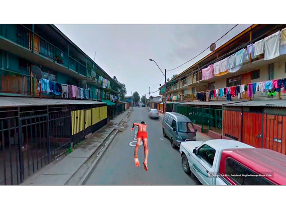 En el caso del trabajo que desarrollé todo estuvo ligado específicamente a la exploración de las imágenes satelitales de Google Maps y a Google Street View. Y en este último, la interfaz que tiene pretende simular el recorrer un lugar físicamente, como si fuésemos caminantes o autos, pero la diferencia es que esta experiencia es posible por el procesamiento de millones de millones de fotografías que son captadas con anterioridad y que dan la impresión de un espacio tridimensional. Al caminar estamos siempre en el presente, en cambio en Street View solo podemos acceder a unas fechas específicas en que los lugares fueron fotografiados, sin embargo, a menos que pases una y otra vez por el mismo lugar, la sensación de descubrimiento y encuentro con lo imprevisto se mantiene por el hecho de lo gigantesco que es el registro online disponible, que al igual que lo físico es completamente inabarcable por una sola persona.