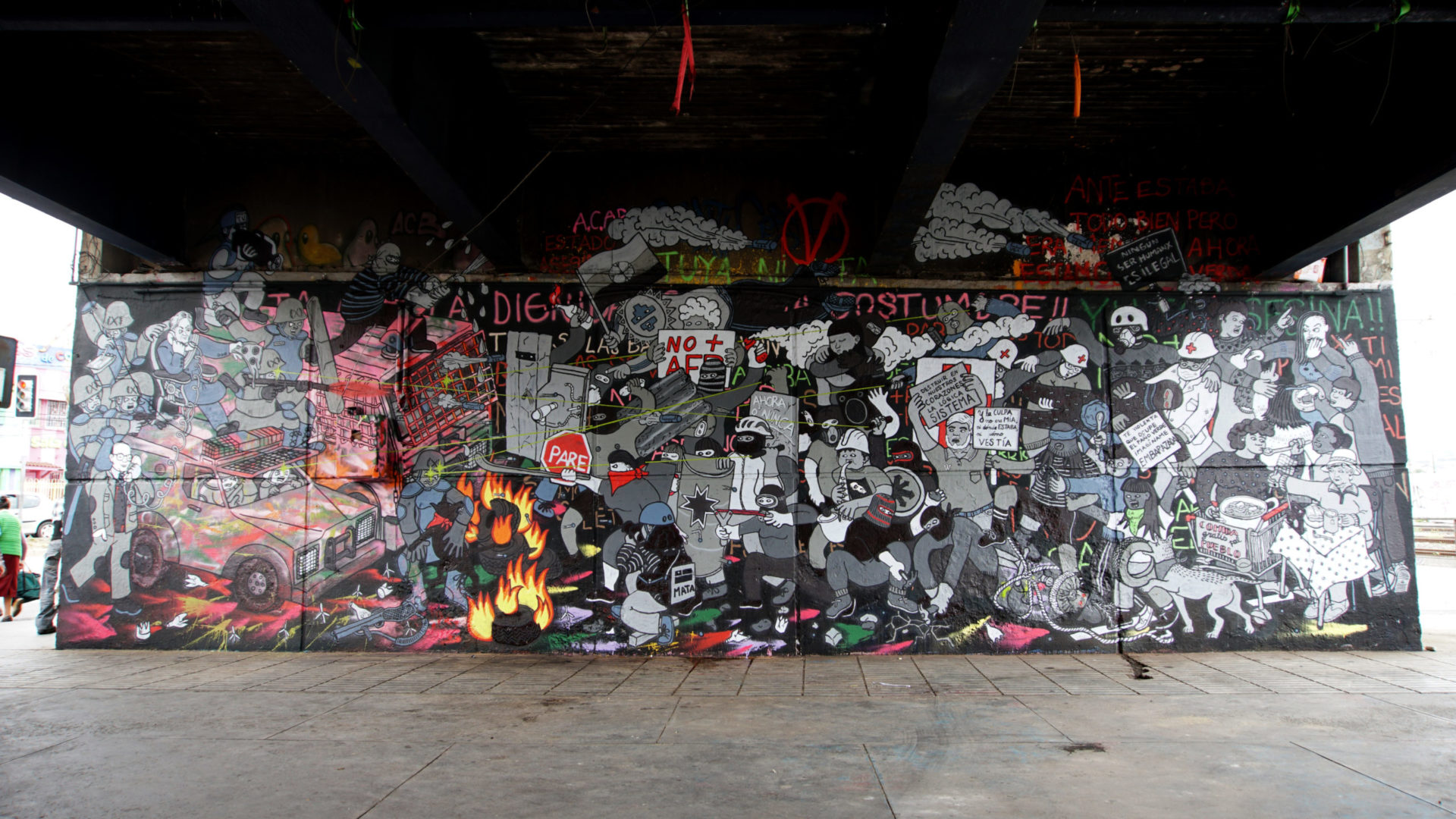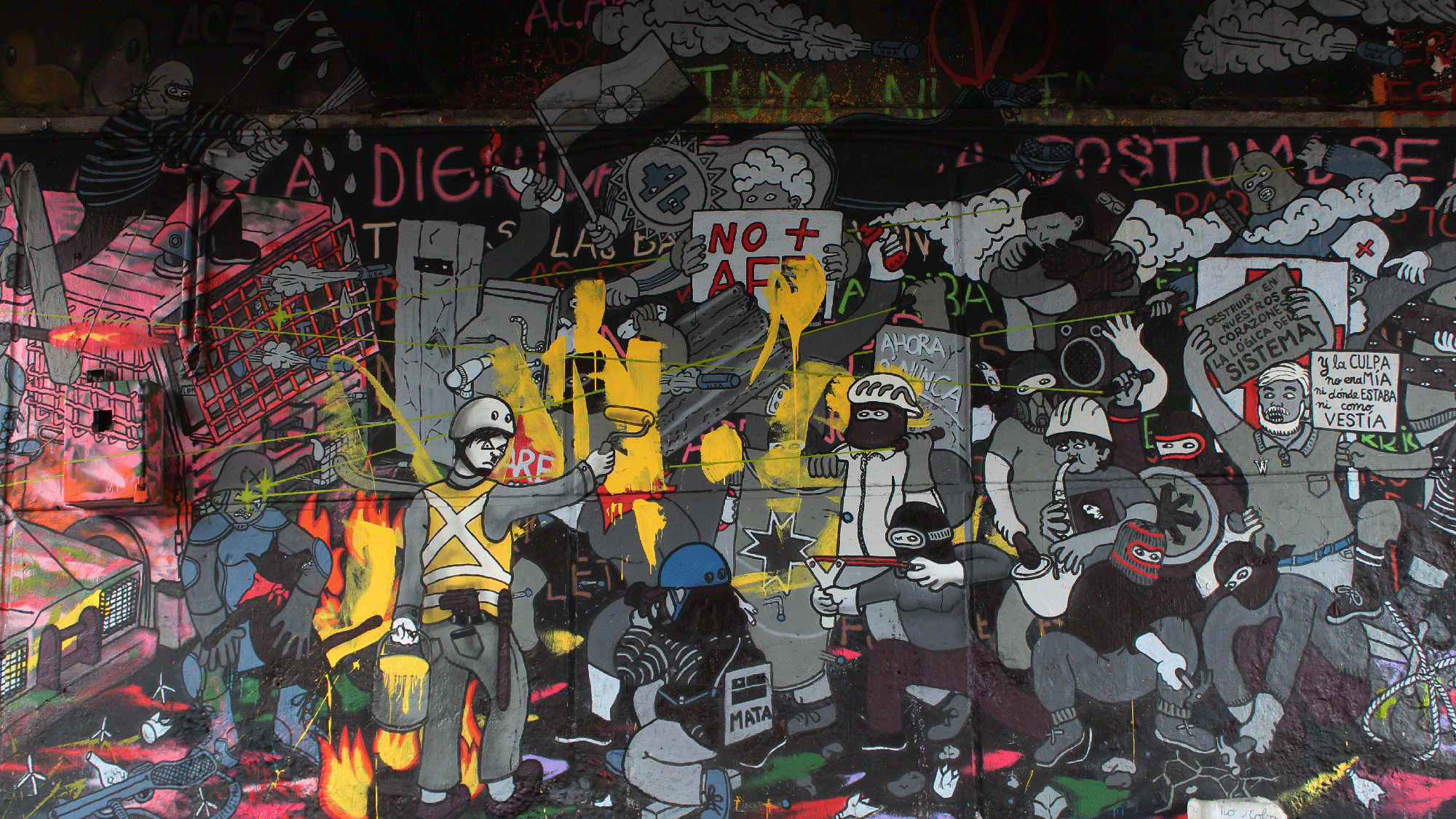 En ese momento me propuse dar una respuesta creativa, que diera cara desde mi propia práctica. Así que añadí a un “chaqueta amarilla” y conservé la mancha censuradora como si ese personaje estuviera manchando la composición. No quise restaurarlo, mi intención era sumar la capa de la censura y resignificarla, para traer a la vista la disputa política de la calle. También sufrí de ciberacoso por parte de estos grupos, recibí distintas amenazas de muerte y mensajes de oído, que me vendrían a buscar, que donde me pillaran me iban a golpear, que era illuminati, masón, chavista… ja ja… Ahí me di cuenta que es gente con una frecuencia súper rara en torno a la realidad, hace conexiones delirantes de lo que uno puede ser y sucede. Después de un tiempo lo volvieron a tapar casi entero con pintura café, a lo cual nuevamente acudí al muro a pintar y resignificarlo, sumándole más personajes en relación a lo que estaba sucediendo a más de una año de la revuelta. Para mí, se tornó como una especie de archivo abierto, un mural dinámico, un retrato de nuestra sociedad.