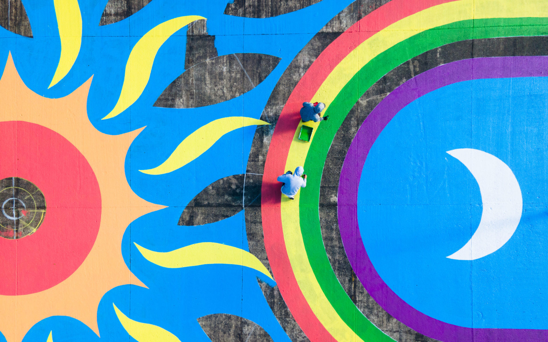El suelar es una propuesta de un nuevo espacio de recreación y juego. Es el lugar de dibujos concentricos y de rayos de sol que se esparsen desde el centro. La cancha se convierte en un atractivo para les niñes, quienes disfrutan de este arcoíris que devuelve la alegría y color a Frutillar. Los rayos del sol proponen nuevas formas de diversión e inspiración.