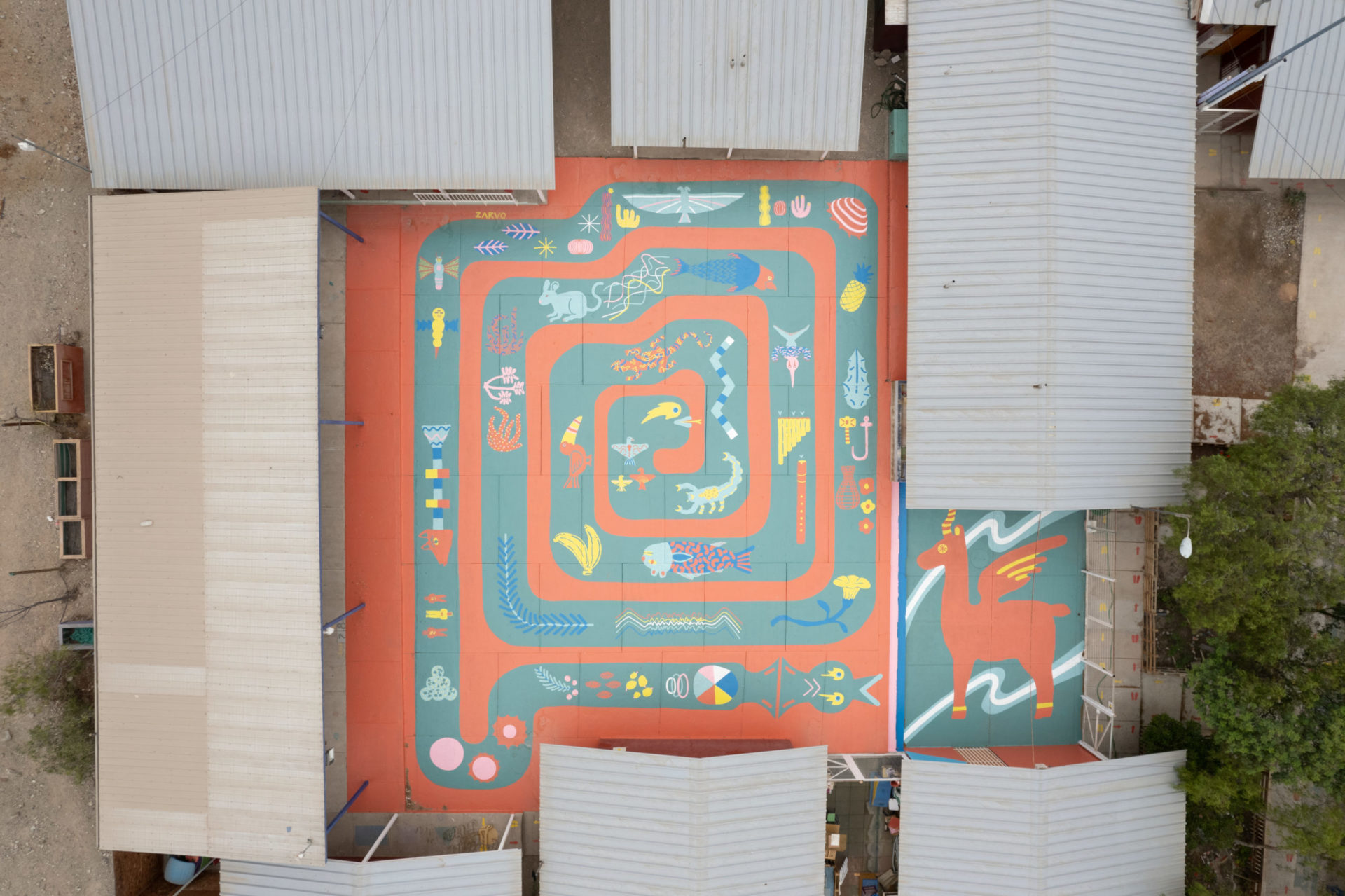 El destacado artista Camilo Ortega, más conocido como Cosarvo (@camilortega.zarvo) fue el encargado de crear el suelar “QR: Queremos Río” en la Escuela Las Brisas de Copiapó. La obra es resultado de un proceso participativo entre la comunidad educativa y el artista, quienes en conjunto levantaron la temática para el diseño.